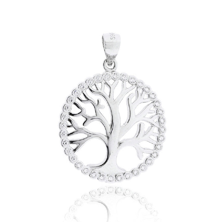 En plata 925 con baño de rodio y acabado en circonitas. Tamaño del colgante: 20mm. Todos nuestros colgantes traen una cadena de plata de regalo