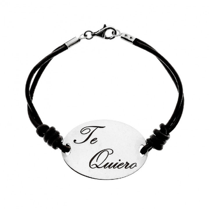 Pulsera de Plata Cuero y Chapa Oval con mensaje personalizado.