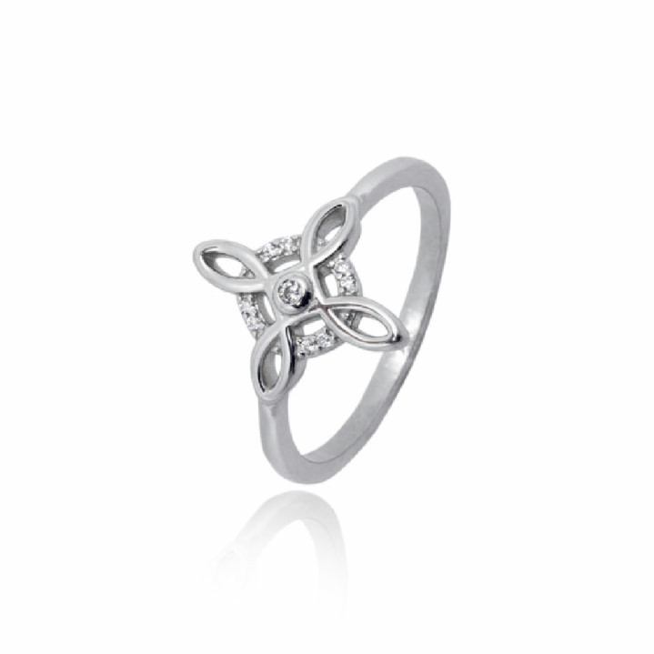 Sortija nudo de bruja con circonitas, plata de ley 925 con baño de rodio.